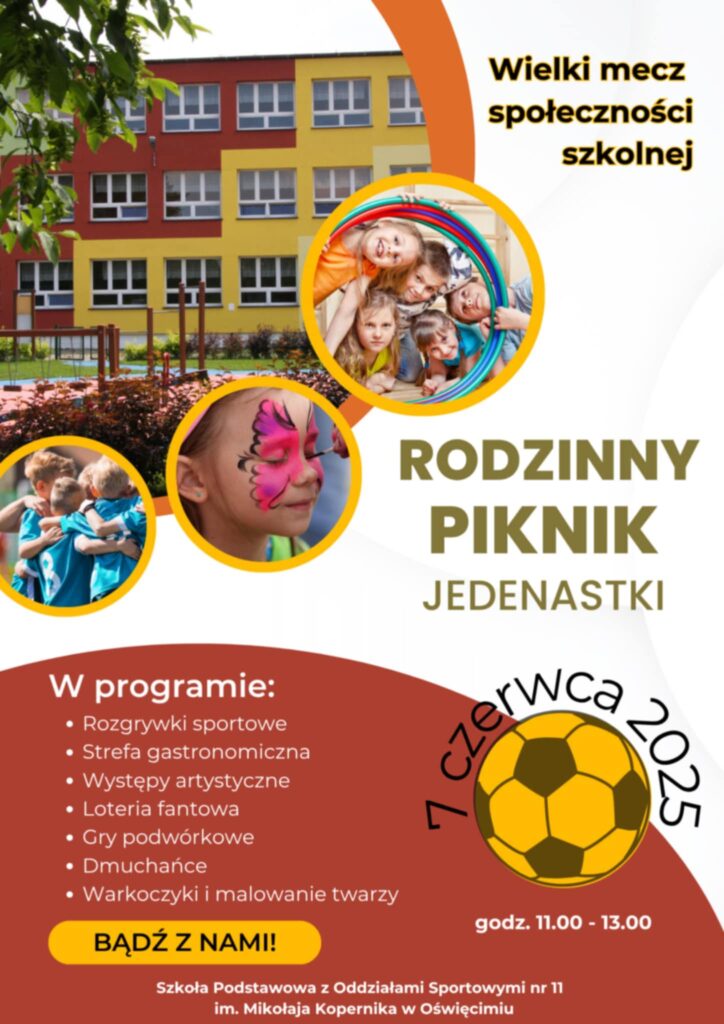 Widzimy się już 7 czerwca 2025 w godzinach pomiędzy 11 a 13. Co Was czeka: loteria fantowa, gry i zabawy, strefa gastronomiczna, występy artystyczne, malowanie twarzy, dmuchańce i hit programu – wielki mecz społeczności szkolnej.